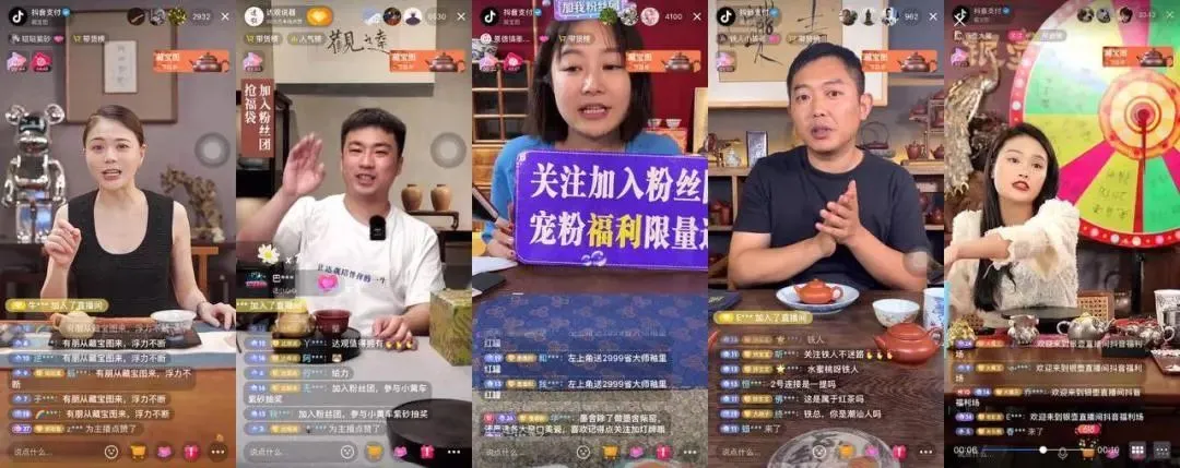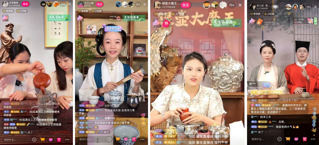 在茶器领域,「文化饮茶季」活动专门开启了「藏宝图」专场,开设“高端陶瓷馆”,邀请汤镇业及6家陶瓷商家展示陶茶的生活艺术,共同带来一场高端陶瓷线上云展会。在具体落地场景中,「藏宝图」开启了一场主题直播+六大分会场+七小时直播IP模式,利用符合时代感的装修与高端好货,进行陶瓷文化和饮茶文化双向度内容发散。除主题化的直播间外,「藏宝图」还通过连麦互动、账号联动、麦序节目单、行业频道等方式,帮助商家搭建起一个中心化阵地,通过优质内容的聚合与导流,吸引了为数众多的传统文化兴趣用户,为高端陶瓷行业积累了足量的高价值经营关系资产。