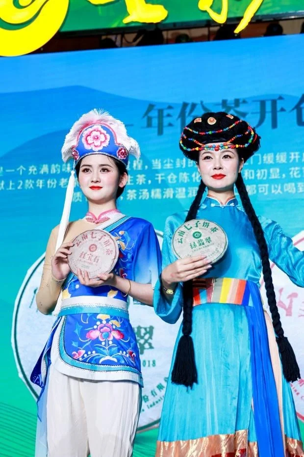 下午场会议中,在极具云南特色的服装走秀中拉开帷幕,七彩云南茶带来了正山春古、古六大正山古树典藏、七彩茶王、有机班章生熟、七彩1889、年份茶开仓等多款春季新品。